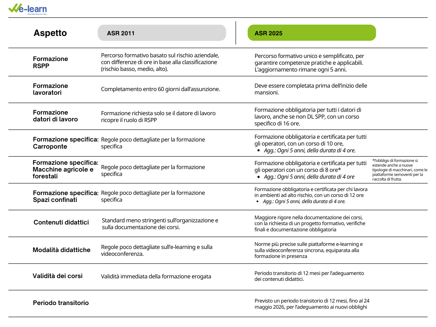 La seguente tabella mette a confronto i principali elementi del precedente Accordo Stato-Regioni in materia di salute e sicurezza sul lavoro con le novità introdotte dal nuovo Accordo Stato-Regioni del 2025.